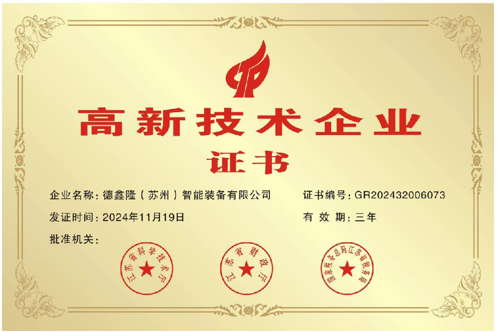 德鑫隆(蘇州)智能裝備有限公司 成功通過高新技術企業認定,三年創業路結碩果。