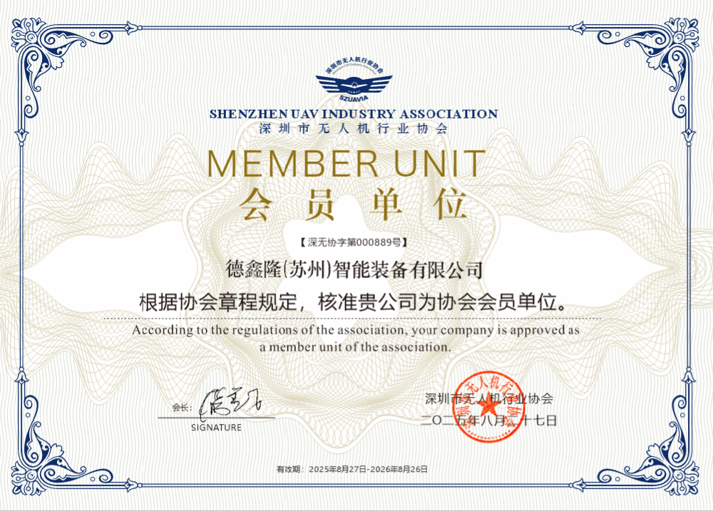 德鑫?。ㄌK州)智能裝備有限公司榮任深圳市無人機行業協會會員單位